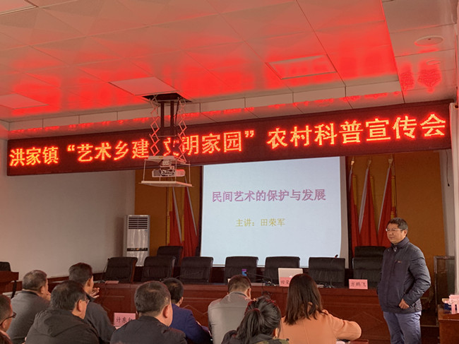 田荣军博士以“民间艺术保护与发展”为主题,通过民间艺术保护现状、存在问题、传承发展三方面内容,用大量生动实例向与会人员作了精彩的讲解,为当地群众系统地梳理了民间艺术的理论认知,进一步普及了保护和传承民间艺术,加强乡村文化提升战略,开展富有特色的艺术活动,打造艺术文化旅游品牌,凝聚乡村活力,改善农民精神风貌,提高乡村经济文化竞争力等多方面的内容。