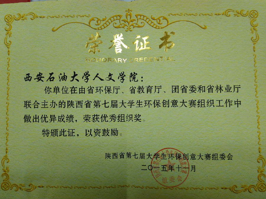 据悉,第七届大学生环保创意大赛由共青团陕西省委员会、陕西省教育厅、陕西省环境保护厅、陕西省林业厅联合举办,大赛主要分为环保工艺品设计类、公益海报创作类、文学艺术类、影像创作类、环保项目申报类等奖项。本届大赛共收到来自全省40多所高校的2600多件参赛作品,经过专家组的层层筛选,评选出147件获奖作品。获奖作品主题鲜明、创意奇特,并在艺术美感、实用价值等方面均达到较高水准,作品展示了新时期大学生的环保意识和创新思维,体现了当代大学生高度的社会责任感。