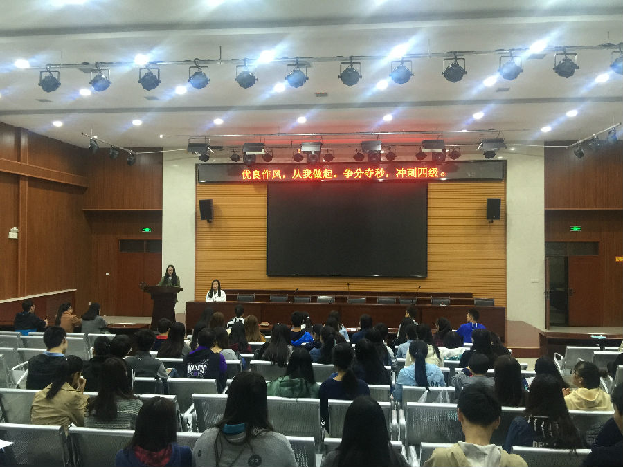 2015级学生在人文经管楼118室参加了以“优良作风,从我做起;争分夺秒,冲刺四级”为主题的英语四级考前经验交流会。