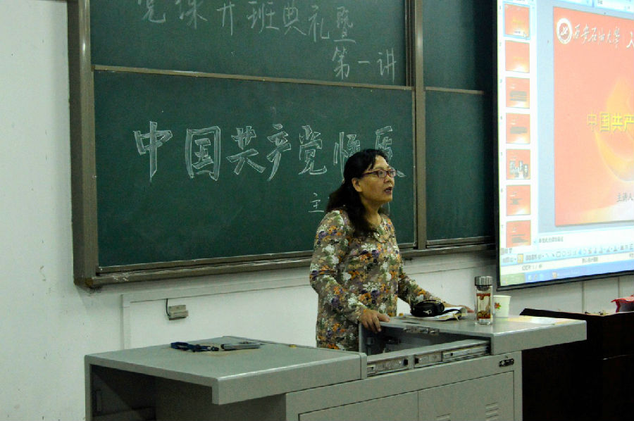 典礼过后,学院党委书记袁玎老师为大家讲授了第一课——《中国共产党的性质》。课堂上,袁书记以三十年党龄的老党员身份带领大家一起回顾了中国共产党95周年的风雨历程。她结合时政、图文并茂地为大家认真讲授,内容详实,深入浅出。学员们听讲认真,学习氛围浓厚。纷纷表示:通过学习更清晰地了解了我党的光辉历史,进一步坚定了入党志愿。