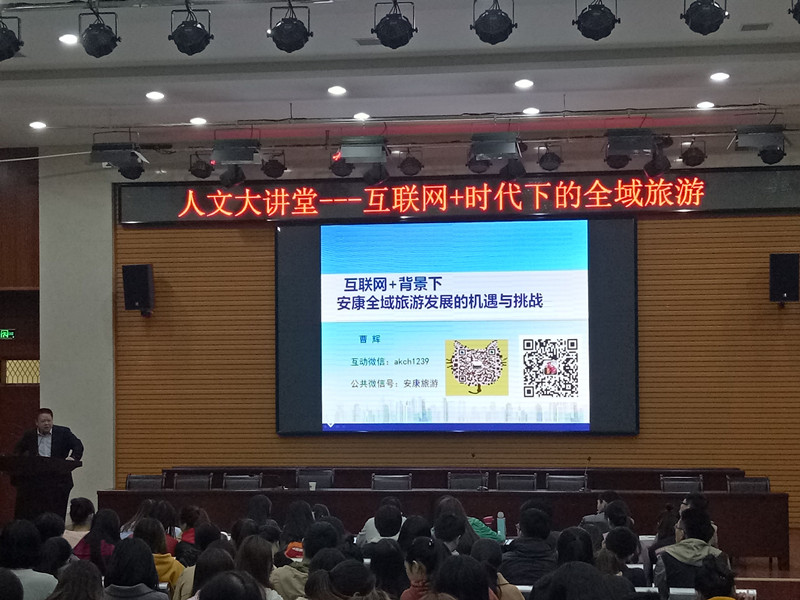 曹辉局长结合自己的成长经历和工作实践,从新时期互联网的特点、互联网思维的取向、互联网传播的特点、互联网+时代下安康的全域旅游开发等四个方面作了一场内容丰富的专题报告。在报告中,曹辉局长介绍了新时期以大数据应用为支撑的智慧旅游建设发展趋势;详细分析了互联网思维的取向、互联网传播的特点,互联网在旅游新服务、新业态和新模式等多个领域的深度融合和创新发展;并分享了自己在互联网+时代下安康的全域旅游开发宣传工作中的文案撰写、微博微信传播策划过程中的实战经验。曹辉局长建议在文案撰写中要做到掌握节点、直击痛点、戳中泪点、聚集焦点、设置看点、形成热点,在微传播工作中要注意先入为主、大格局视野、打破惯性思维等十项传播策划攻略。曹辉局长以秦巴明珠宣传片为例,阐述了安康旅游由点线旅游向全域统筹发展,由单一观光型向观光休闲度假复合型产品转型,由冷热不均的节假日旅游向稳定有序的常态化旅游拓展,大力促进安康生态旅游产业与现代农业、支柱工业、文化产业、健康养老、特色小镇建设和脱贫攻坚等深度融合,不断延伸生态旅游产业链条,加大旅游宣传推介力度,加快完善“快旅慢游”体系,着力构建快速旅游交通网络,倾力打造核心景区慢游系统,让游客到安康进得快、游得慢、玩得好。要不断提高旅游综合服务质量,特别要大力实施“互联网+旅游”行动计划提升服务能力和水平。曹辉局长的报告内容丰富,语言风趣幽默,获得师生们阵阵掌声。此次“互联网+时代下的全域旅游”专题报告对于对拓宽我院学生的人文视野,丰富学生的精神文化有着积极作用,进一步为我院文化建设及开展“书香校园”活动助力。