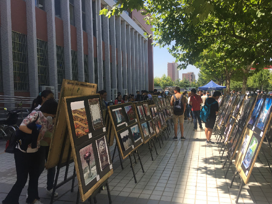 在新校区B区食堂外开展了以“时光·印象”为主题的摄影展。学院党委书记袁玎、副院长张海涛参观了展览。