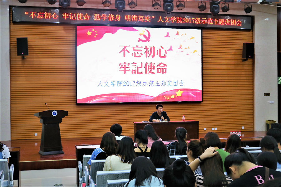 2017级在鄠邑校区经管人文楼就业指导中心多功能厅召开以“不忘初心、牢记使命、勤学修身、明辨笃实”为主题的示范主题班团会暨年级大会。会议由辅导员文爱国主持,2017级全体学生参会。本次会议围绕两部分展开,一是理论学习与分享,二是工作布置与安排。