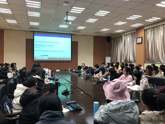 阎平教授通过对活动主题“Live a Happy Life with Two or More Languages”即“多语人生”的解释拉开了本次讲座的序幕。首先,阎老师为大家阐述了汉语国际教育专业在当前科技时代中存在的价值——即使智能翻译精准化、语言学习移动化,都不足以成为我们看轻“汉语国际教育”专业的理由。随后,阎老师具体讲解了汉语国际教育专业的培养过程,并深入浅出地解释了第二语言、语言习得等专业相关基本概念及理论。接着,阎老师向大家普及了了解本专业前沿动态的方式,为同学们学术研究方向的确定提供了重要参考。最后,阎老师为同学们展示了维基百科中专业相关基本概念的英文注释,为同学们专业知识的学习打开了新视角、提供了新方式。
