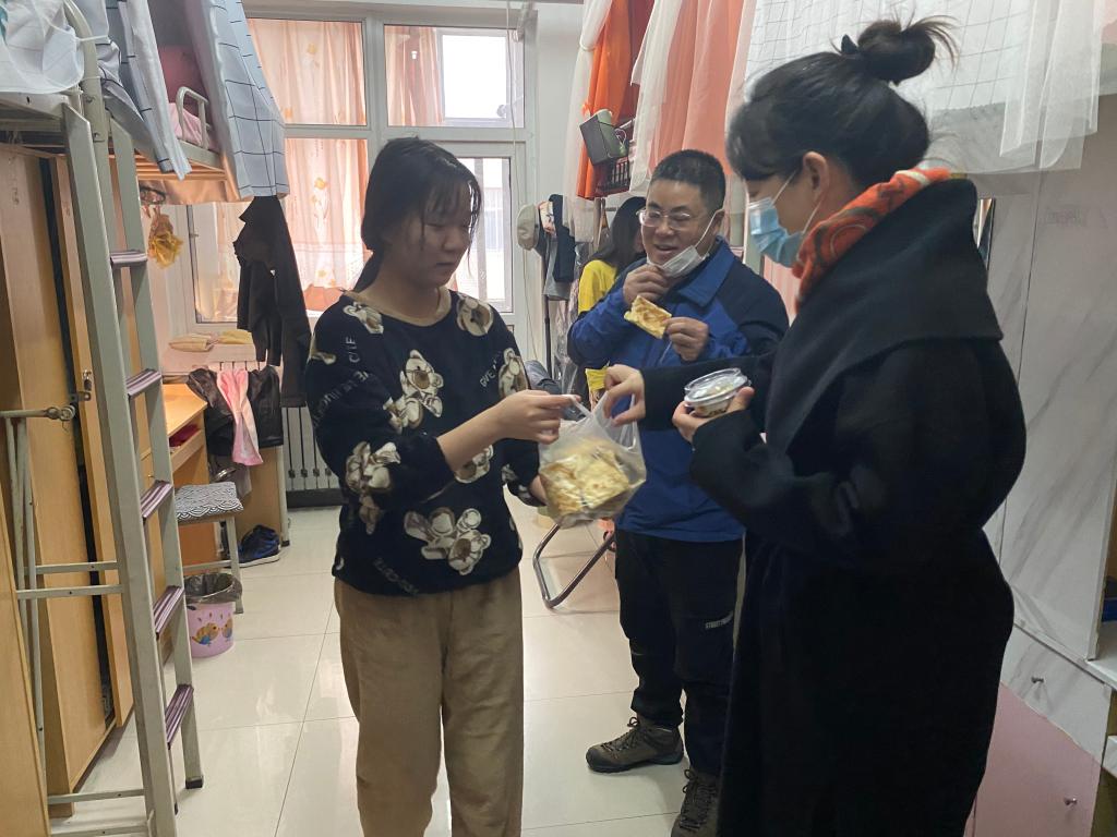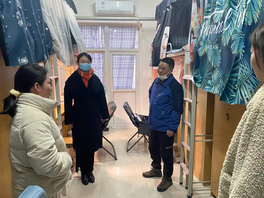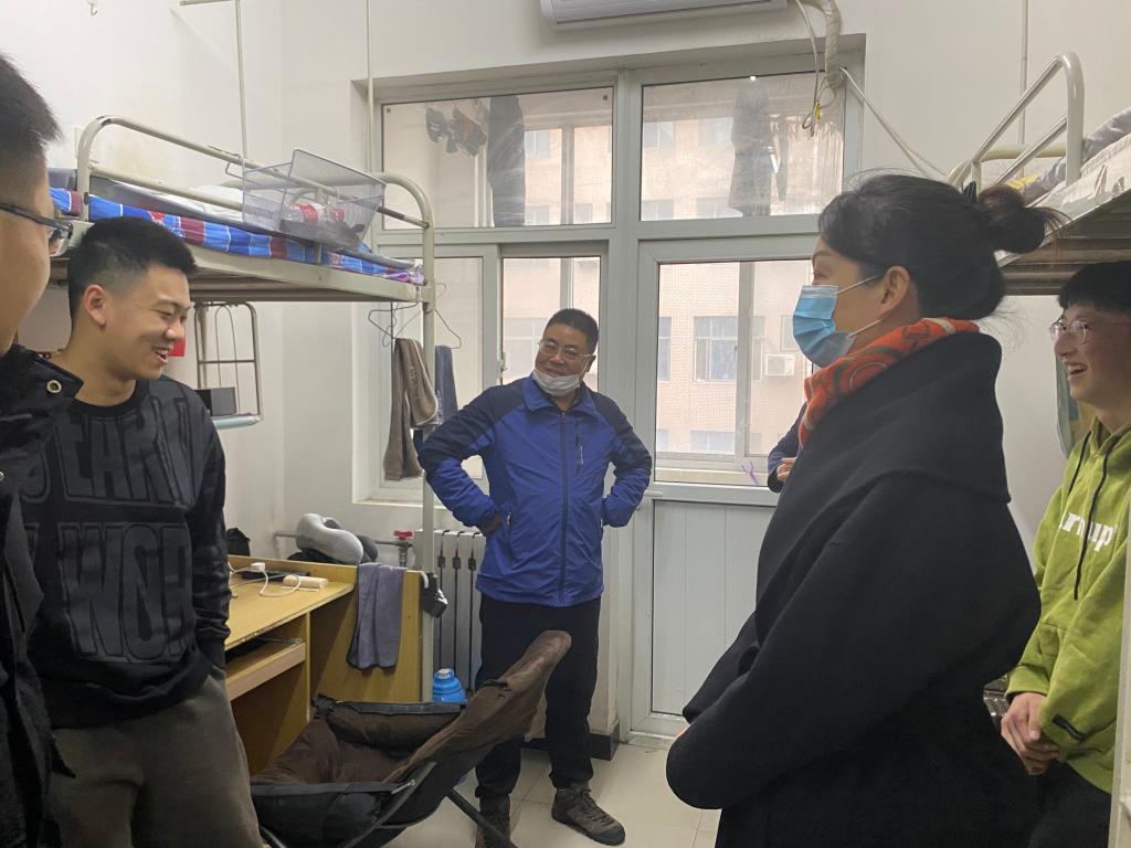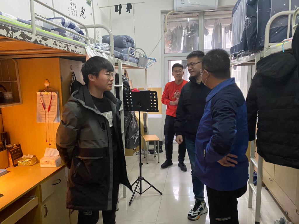 党委书记余小勇、党委副书记盛丹、18级辅导员范嘉欣、19级辅导员张泽正、20级辅导员李彦兵前往学生宿舍走访了学生宿舍,看望慰问返校学生。