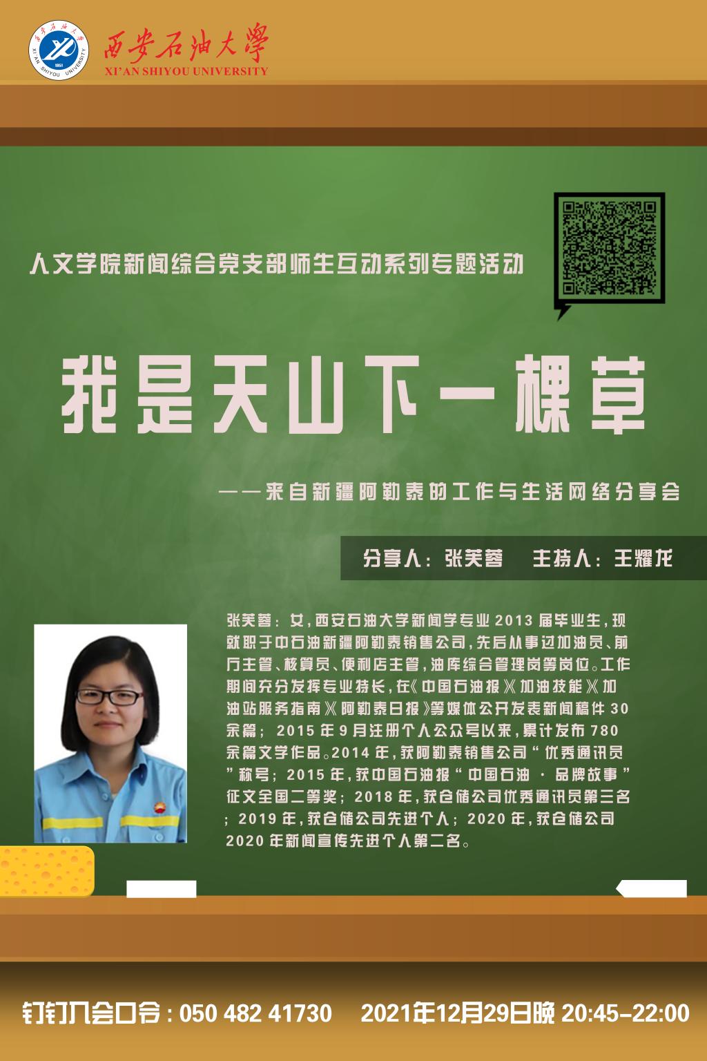 在此次的线上交流中,张芙蓉向同学们介绍了她在新疆的工作和生活经历。由于边疆环境艰苦,工作也比较单调枯燥,不少同期的同事都先后离职了。只有她一直坚守岗位,吃苦耐劳,经受住了艰苦环境的考验,正如“天山下的一棵草”,在那里奋斗出了属于自己的精彩人生。除了做好本职工作,她还充分发挥专业特长,长期主动担任通讯员的职责,展示了一名扎根于祖国边陲石油企业基层工作者的责任与担当。