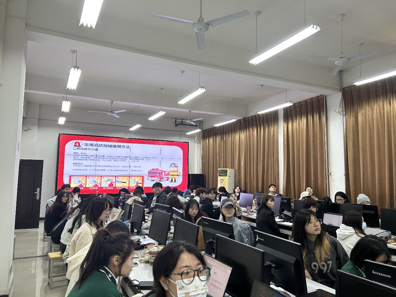 实验室特征,主要讲解用电安全及注意事项、火灾逃生、应急处置、灭火器使用方法。应急演练环节,组织学生开展了火灾现场疏散逃生。