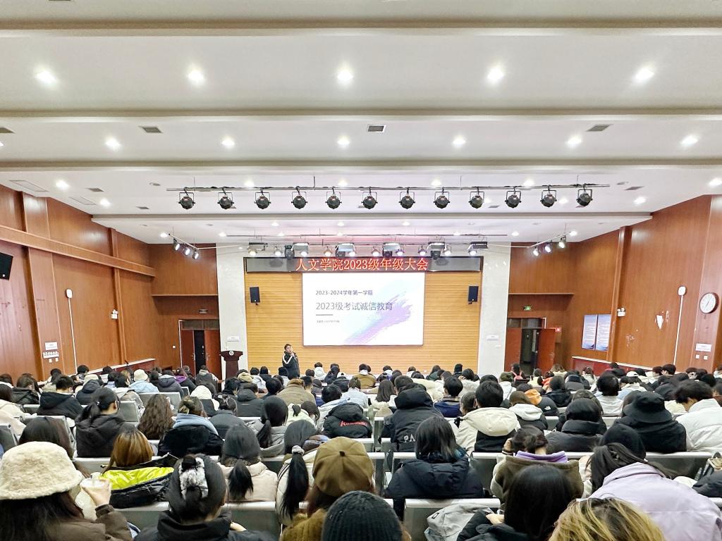 在鄠邑校区崇文楼就业多功能厅召开2023级年级大会暨考试诚信教育大会,会议由2023级辅导员王凯杰主持,2023级全体本科生参会。