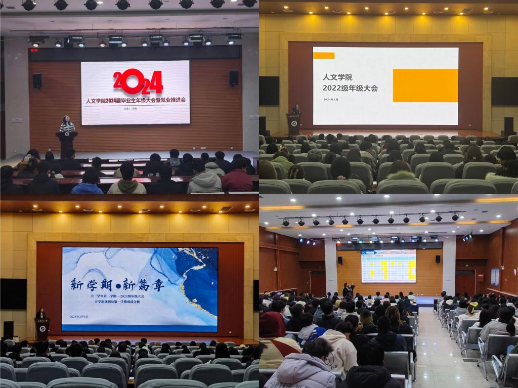 在各级年级大会上,各级辅导员主要强调了以下三点:第一是学情分析。辅导员总结了上学期各班成绩,并向学生们强调了绩点的重要性,对尚未通过四级的同学予以鼓励,提醒有未通过课程的同学按时参加重修,强调了第二课堂的相关要求,希望大家在新的学期获得好成绩。第二是学期计划安排。从评奖评优、考研考编、学科竞赛等方面向学生全面概述了未来这一学期应该努力的方向。此外,辅导员通报了本年度考研初试情况,鼓励大家树立目标,拼搏奋发。第三是校园日常要求。针对近期国内发生的重大火灾事件,辅导员带领大家阅读了关于西安市电动自行车违规停放充电法律责任的通告,强调学生严禁将电动自行车带入公寓楼充电,提醒学生注意用电、用水安全以及出行、交通安全,谨防电信诈骗、强调宿舍安全,禁止使用违规电器、私接电线、养宠物、私自搬出宿舍等行为的出现。同时,毕业班辅导员还就本学期日程安排、春招注意事项等问题进行强调和动员。