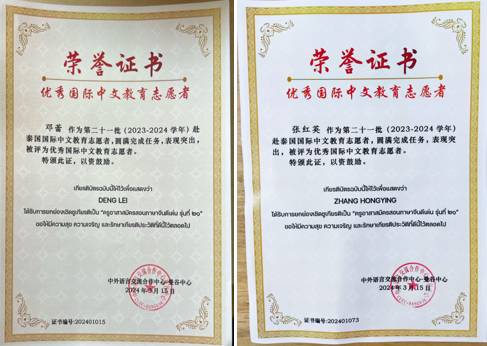 汉语国际教育专业2021级研究生邓蕾、2022级研究生张红英作为第21批(2022-2023学年)赴泰国国际中文教育志愿者,圆满完成任务,表现突出,被评为“优秀国际中文教育志愿者”。