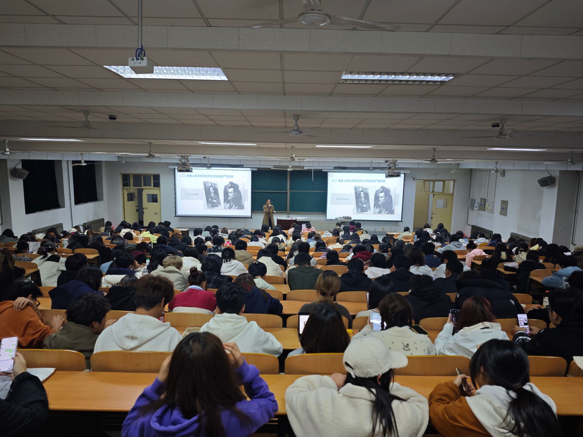 在讲座中,赵老师带领同学们正确认识宿舍中发生的人际关系冲突,鼓励同学们理性分析,面对宿舍冲突时不要过于惊慌焦虑,看到其中蕴含的解决问题的契机,了解对方内心世界,助力日后更好相处,并创设情境邀请同学上台分角饰演了两场心理话剧,将同学们置身于模拟的宿舍环境之中,在妙趣横生的话剧中学习处理人际关系的正确方式。
