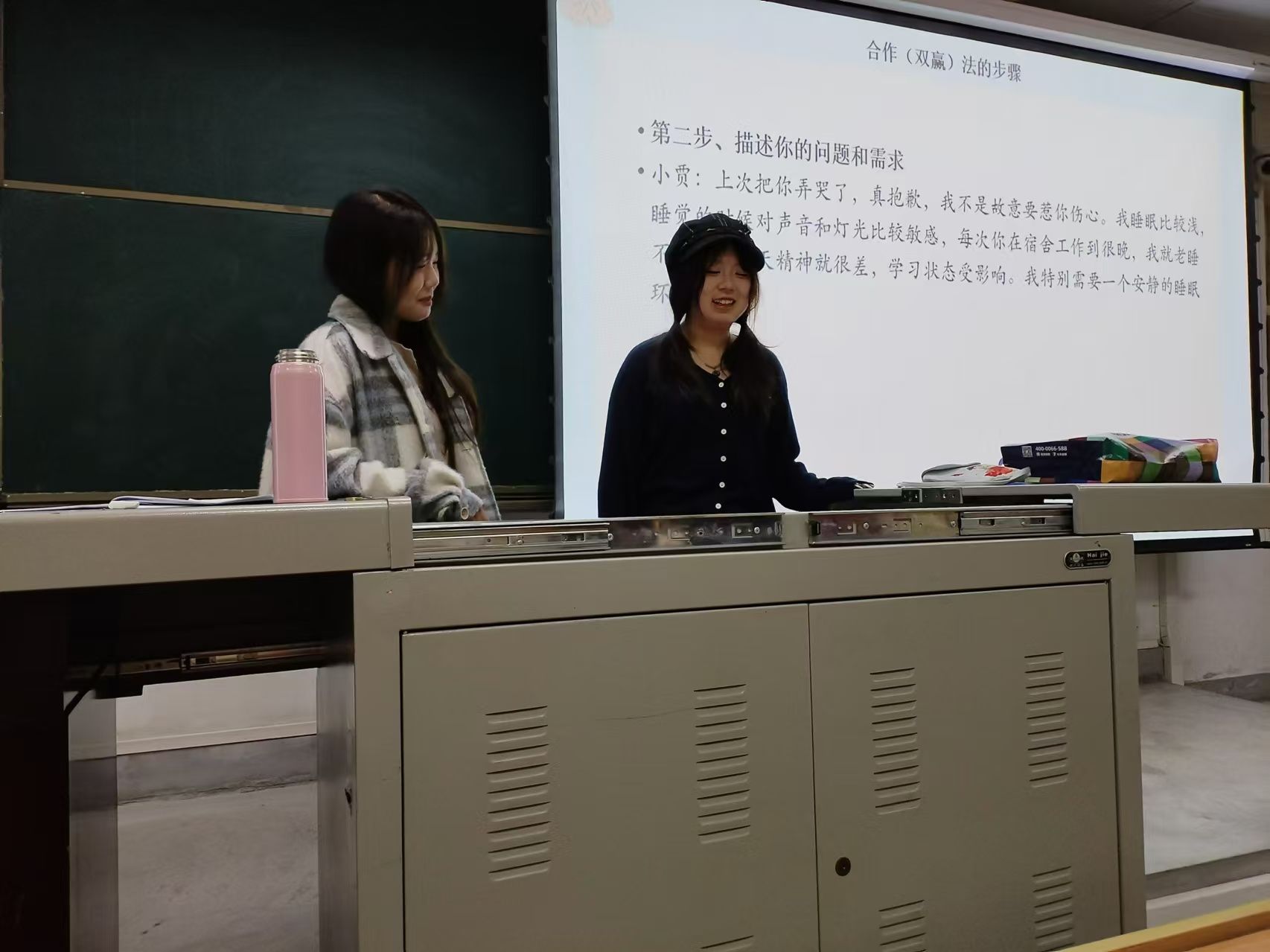 最后,赵老师从心理学的角度介绍了“知觉检核”、“枕头法”以及“合作(双赢)法”三种应对宿舍人际关系冲突的实用沟通策略,通过情景模拟帮助同学们更好地理解使用这些方法,并提出要辩证地对待冲突,及时发现问题并主动沟通,以平和冷静的态度解决宿舍矛盾,维护宿舍和谐。