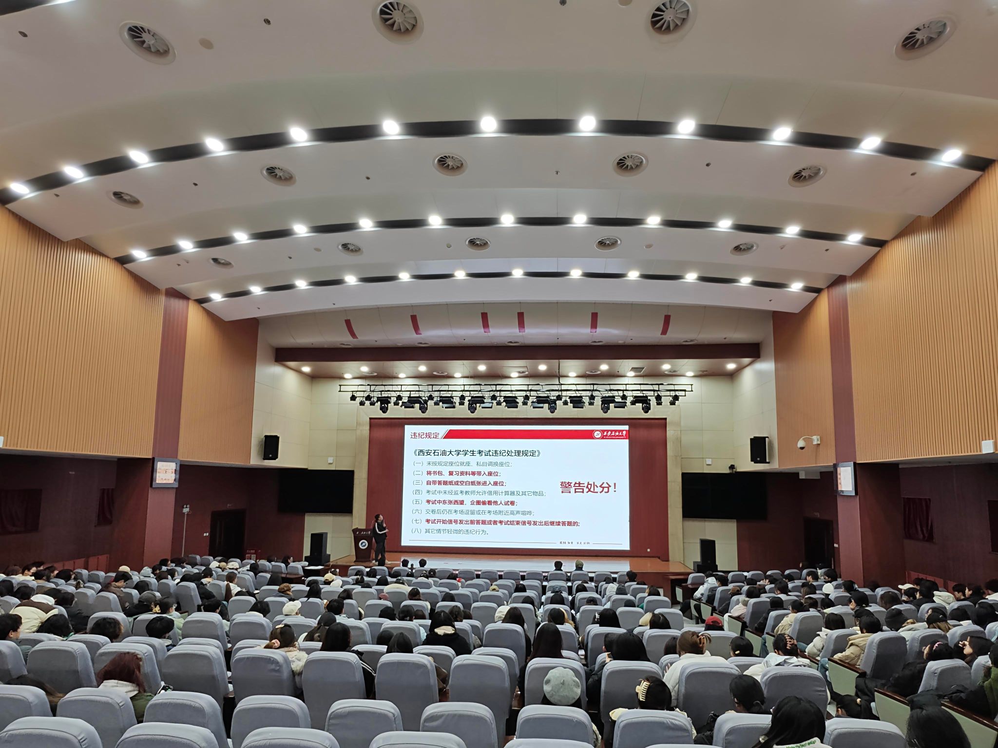 在鄠邑校区弘石学术报告厅召开2023级考试诚信教育暨节前假前年级大会,2023级辅导员王凯杰主持,2023级全体本科生参会。