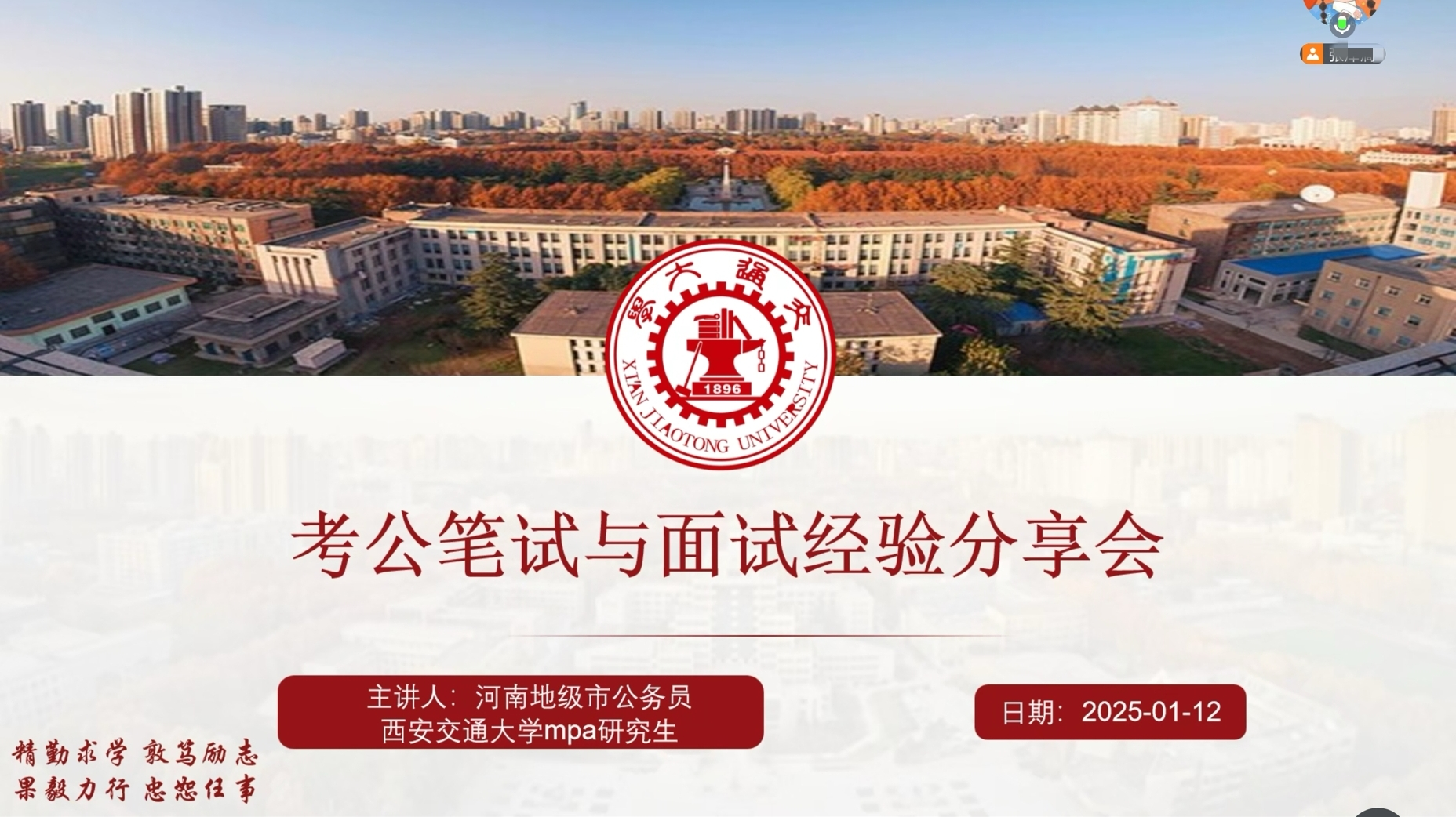 积极对接西安交通大学公共管理学院,于1月12日下午合作开展了就业考公面试指导讲座。此次活动吸引了众多怀揣公职梦想的2025届毕业生参与,线上会议氛围热烈。