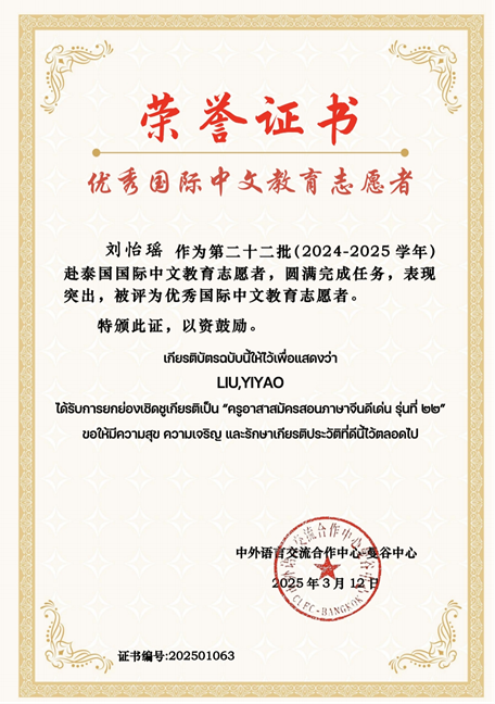 国际中文教育专业2023级硕士研究生刘怡瑶荣获“优秀国际中文教育志愿者”荣誉称号。该荣誉由中国教育部中外语言交流合作中心(简称“语合中心”)与泰国教育部联合颁发,旨在表彰表现突出的志愿者,本批次共828名志愿者,80人获此殊荣。