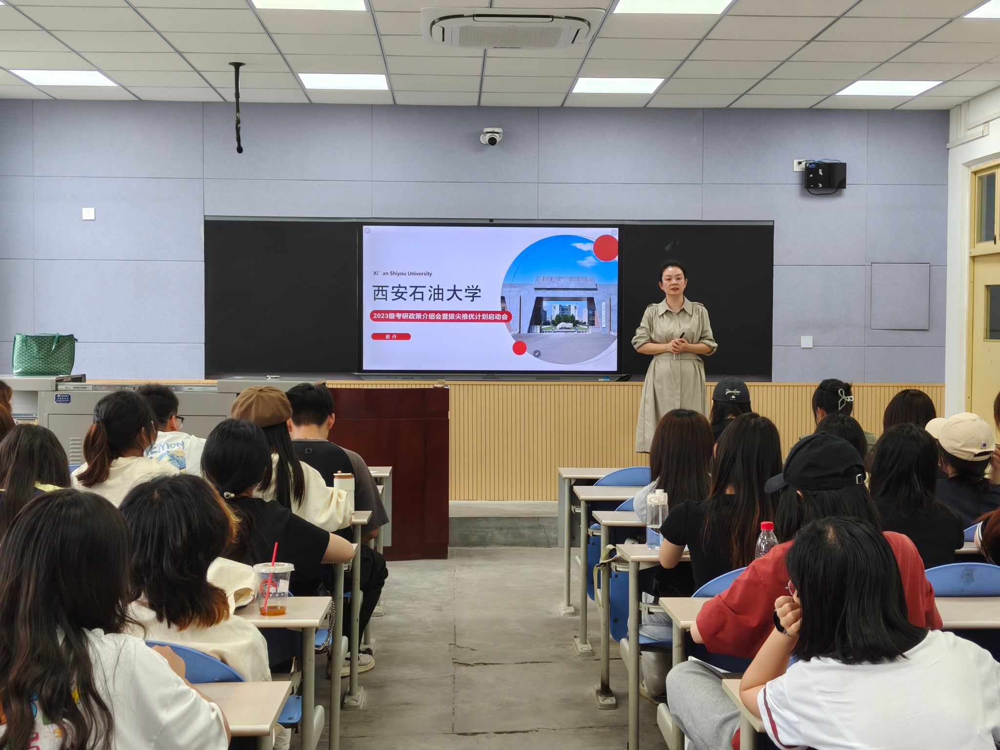 在鄠邑校区博览楼B217召开2023级考研政策解读会暨“拔尖推优”启动会。学院党委副书记盛丹主讲,2023级67名学生参会。