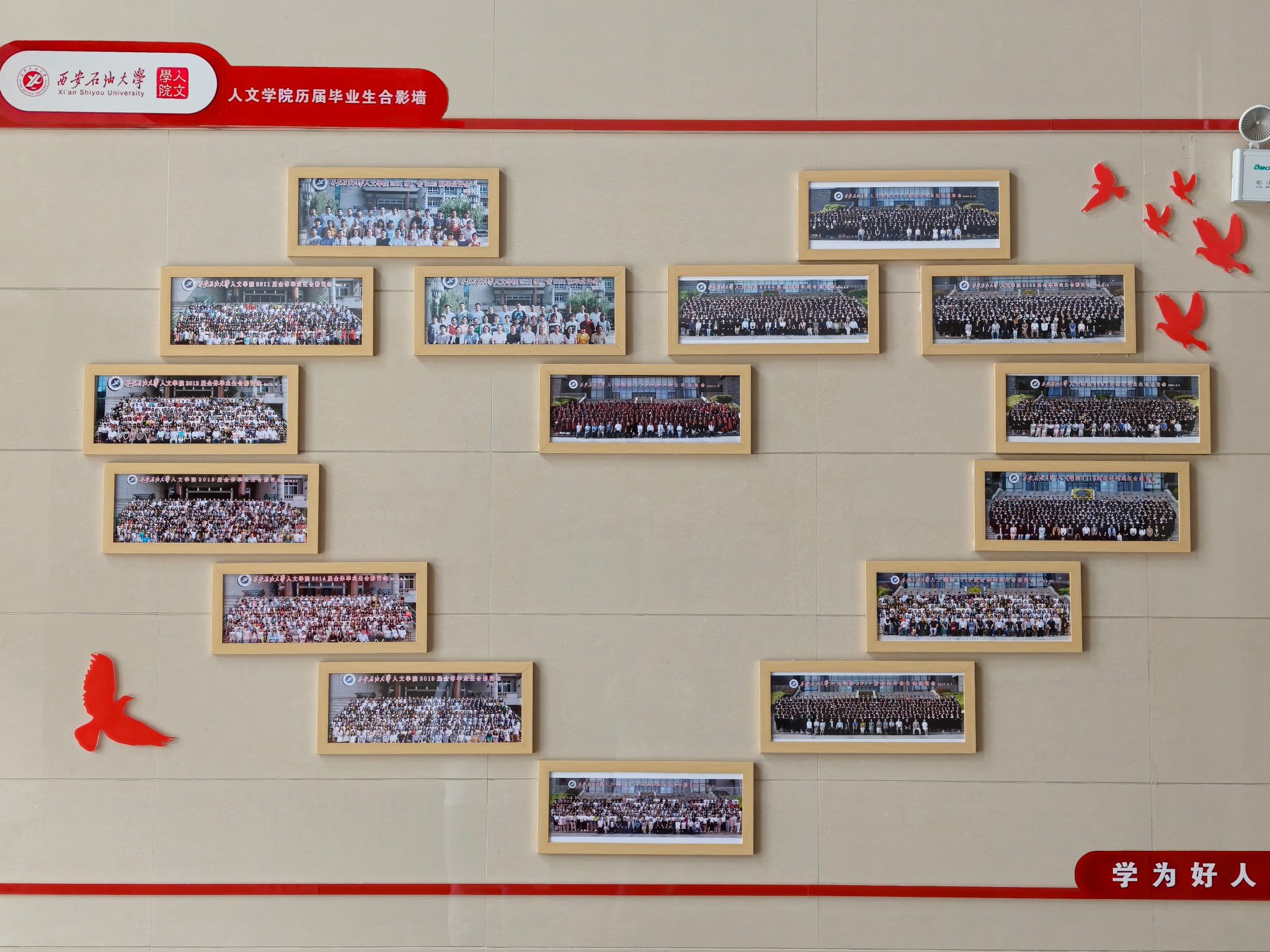 精心策划制作了一面满载历史记忆的历届毕业生合影照片墙。7月6日,这面饱含深情的照片墙在鄠邑校区崇文楼南门布置完毕,静待校友们归来。