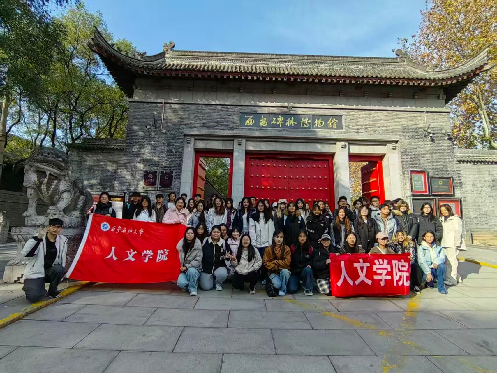 2024级汉语言文学专业全体同学及6位留学生,在郑莉、赵文婷、贺颖3位老师的带领下开展了认知实习,先后参观了西安碑林博物馆、书院门以及陕西考古博物馆。