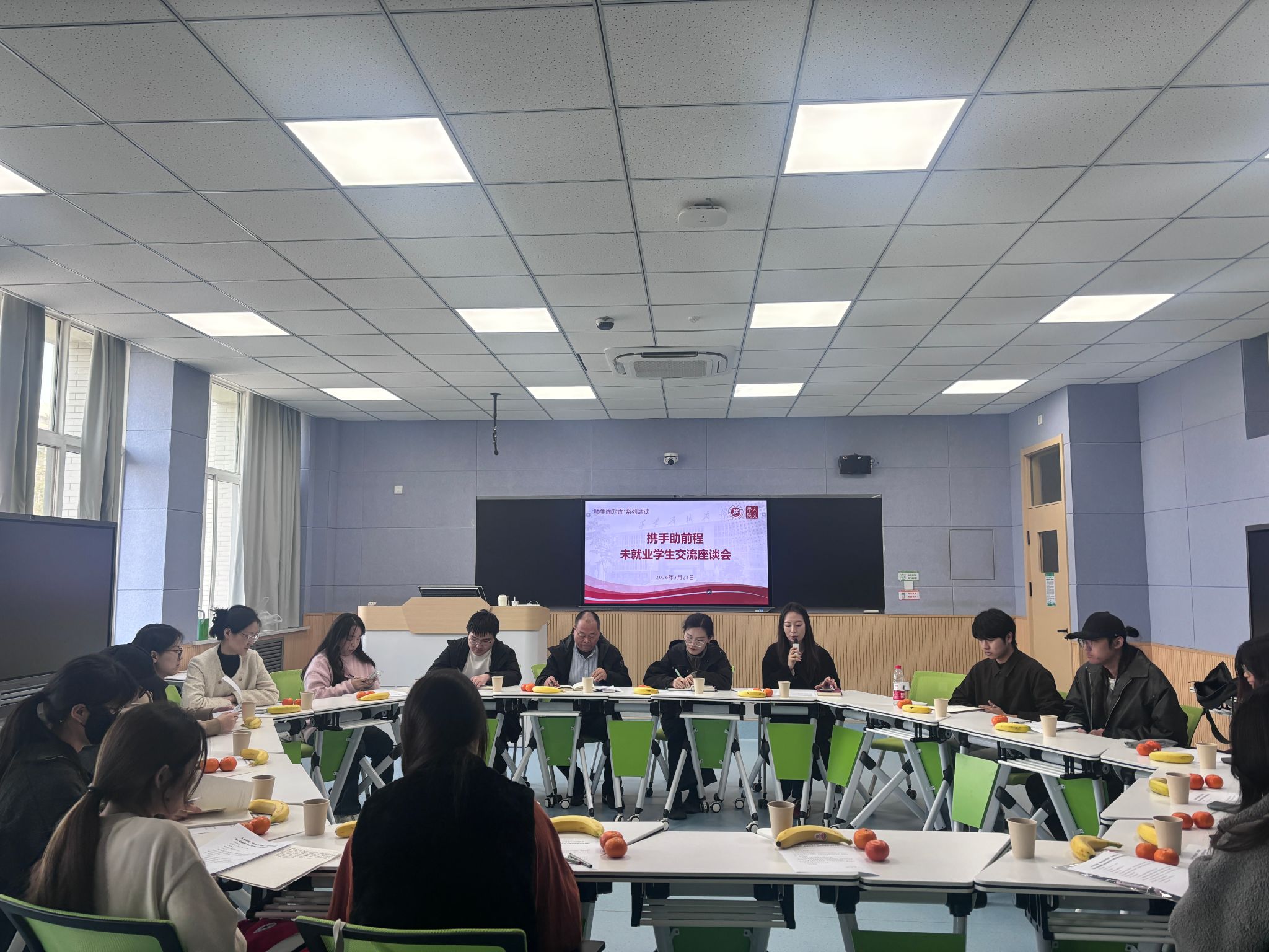 在鄠邑校区博览楼A203教室召开“师生面对面”系列活动之“携手助前程”未就业学生交流座谈会。学院党委书记彭革伟、副书记郭媛,毕业班辅导员范嘉欣、李峤及未就业毕业生代表参会,会议由范嘉欣主持。