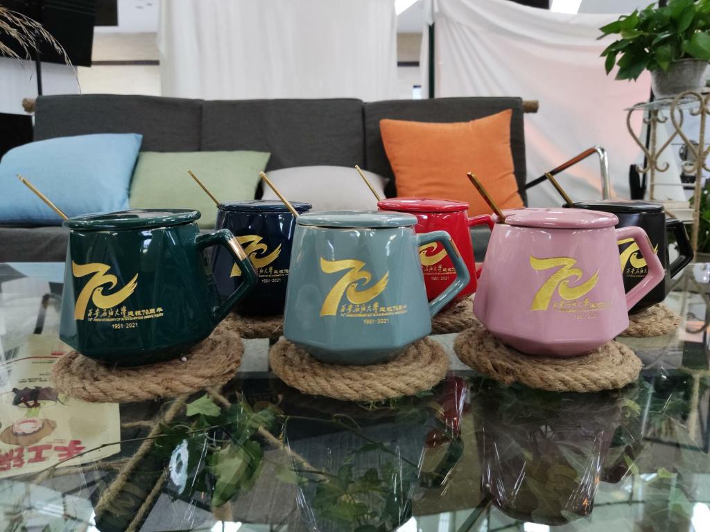 七十周年校庆杯子与主题相呼应。单人座椅由黑色轮胎制成,编织绳填充轮胎空心部分,加上黄色坐垫点缀。花篮、金属花筒均由废品改造而成,充分体现“废物利用,变废为宝”的设计理念。
