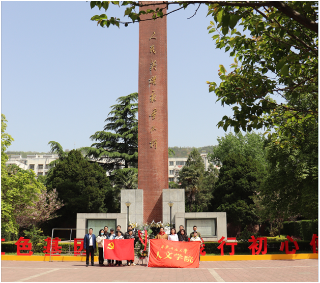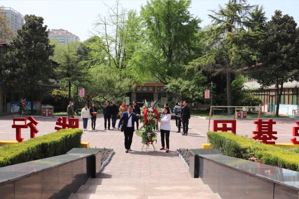 全体党员和教职工敬献花篮,凭吊56位在宝天铁路修筑过程6年中牺牲的先烈。