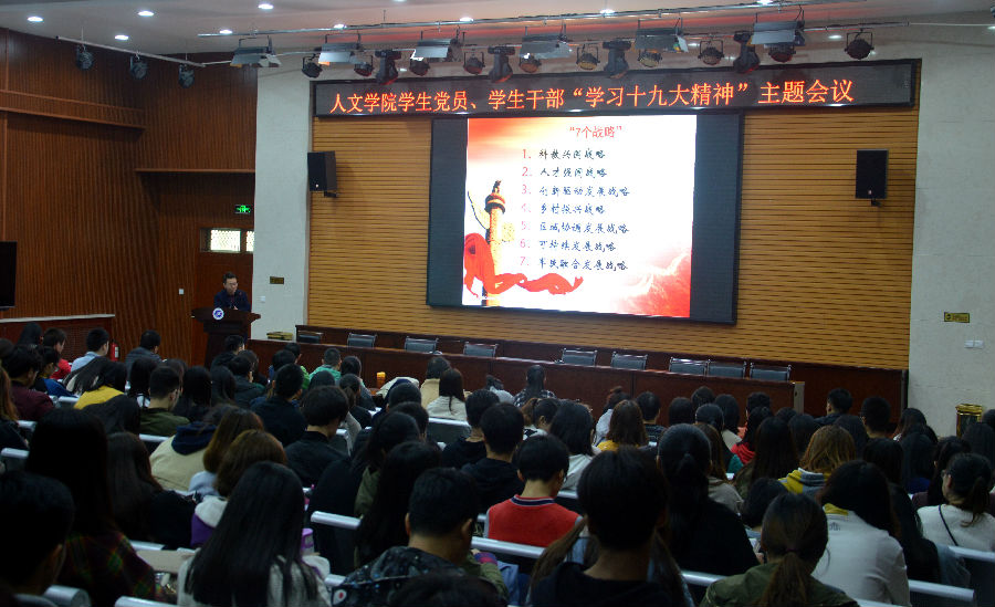 在院系楼118室召开学生党员、学生干部“学习党的十九大精神”主题大会,学院全体辅导员、全体学生党员、团委学生会主要学生干部参加,会议由学院党委副书记李善建主持。