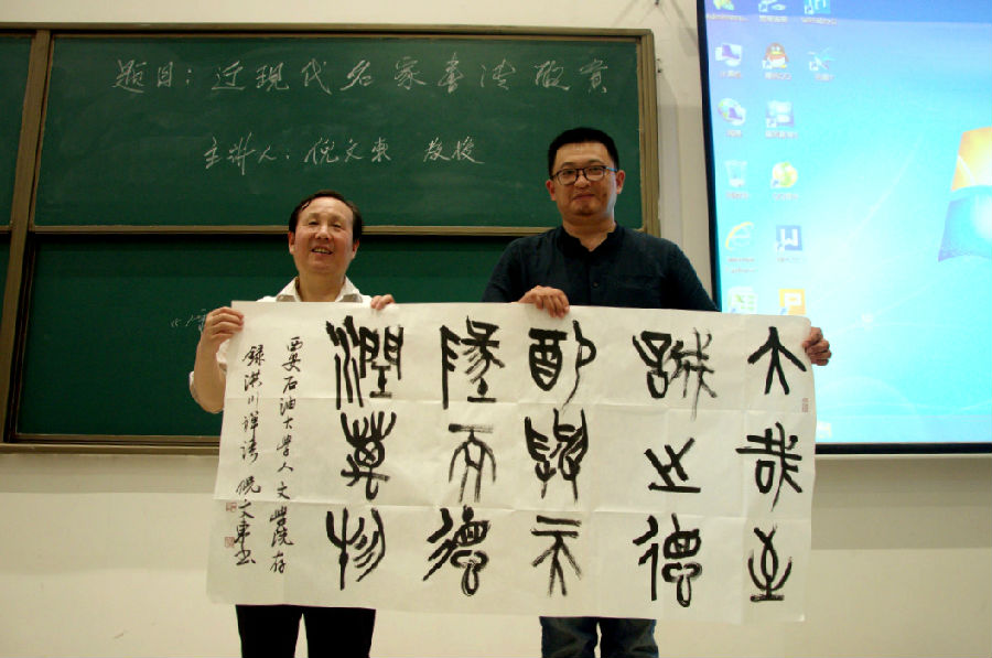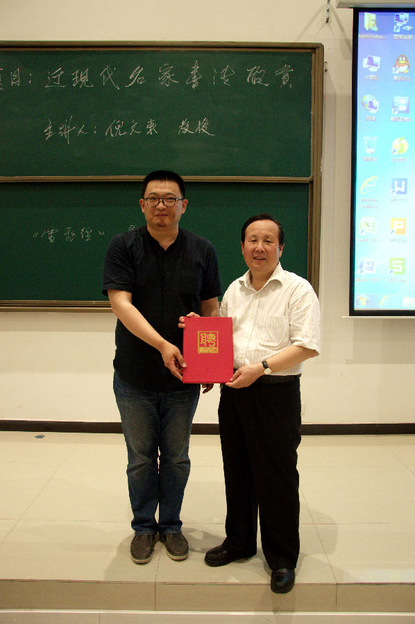 倪文东教授选取了于右任、李叔同、沈尹默、沙孟海、启功等十位近现代书法名家,结合其生平事迹、学书经历分析了其书法造诣、枚举了其书法创新特点、评价了其在中国书法史上的重要地位。倪教授认为书法非写字,中国书法根植于博大精深的中国传统文化,学书必要有深厚的学养、广博的积淀再加以超乎常人的勤学苦练方可有所成就。倪教授告诫学子们,功夫在“书”外,学书要以提高自身的文化素质修养为前提。倪教授的讲座深入浅出、诙谐风趣,赢得了老师、学生们的阵阵掌声。