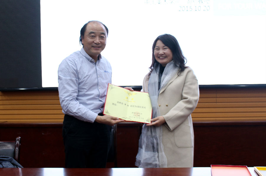 讲座结束后,李涛院长向周刚教授颁发了客座教授聘书。此次报告会的成功举办,进一步为腐漫画 “书香校园”建设活动助力,对拓展学院学生的人文视野,提升专业素质,丰富精神文化有着积极作用。